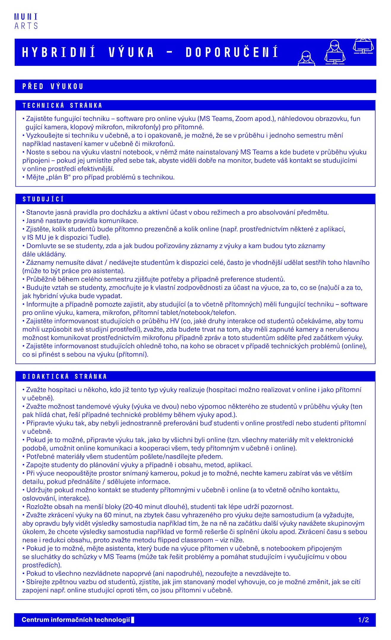 Stránka s doporučeními pro hybridní výuku, zahrnující technické a studijní tipy a směrnice.